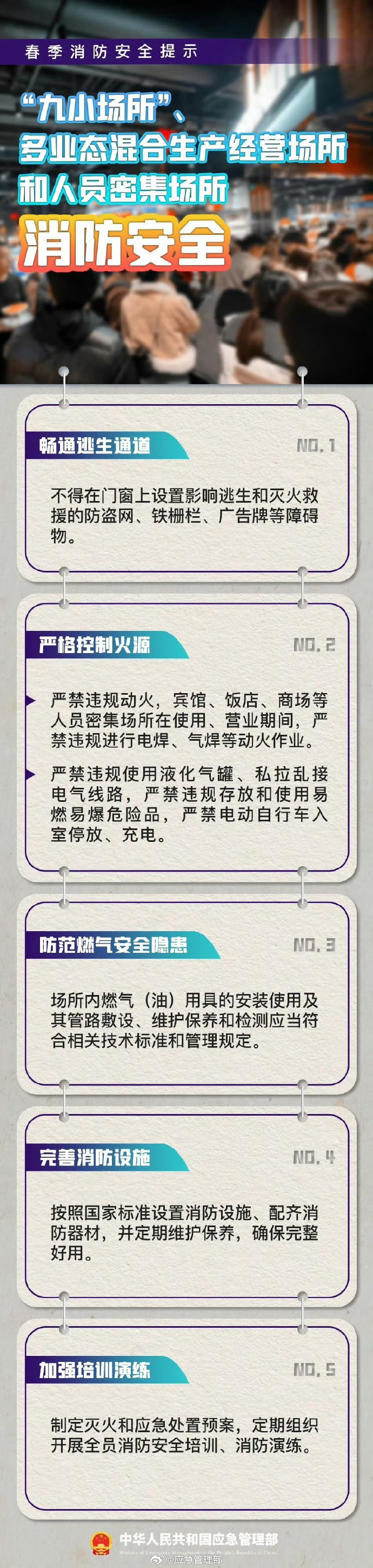 春季天干物燥,大風(fēng)天氣多,一個小火星就可能引起火災(zāi)。因此,在生活生產(chǎn)中,一定要注意防范安全隱患。 “九小場所”、多業(yè)態(tài)混合生產(chǎn)經(jīng)營場所、人員密集場所等要注意哪些事項(xiàng)?