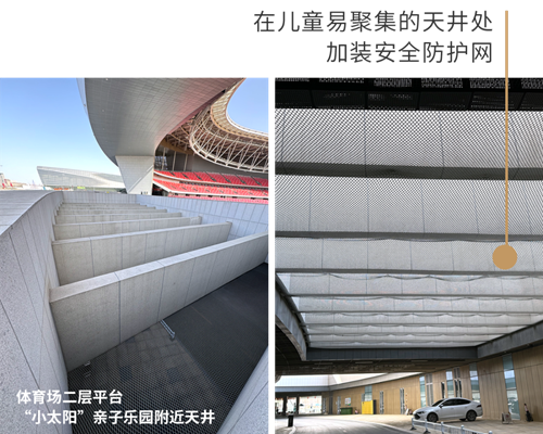 快樂成長,安全為先。為了確保兒童游樂區(qū)的安全,鄭州奧體中心從細(xì)節(jié)處著手精心加裝了多種防護(hù)裝置,在奧體中心西北角區(qū)域加裝隔離花箱、石墩,確保行人與機(jī)動(dòng)車分離。同時(shí),在體育場二層平臺(tái)兒童聚集較多的天井內(nèi),加裝防護(hù)網(wǎng);在健身器材一側(cè)加裝防護(hù)欄;在通往二層平臺(tái)的步梯兩側(cè)加裝防滑球......這些防護(hù)裝置均經(jīng)過嚴(yán)格的現(xiàn)場論證和質(zhì)量檢測,確保其具有優(yōu)異的耐用性和穩(wěn)定性。通過這些措施,鄭州奧體中心致力于為孩子們打造一個(gè)既充滿樂趣,又安全無虞的游樂環(huán)境。