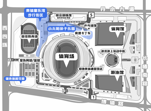 奧體童樂灣步行街區(qū)西鄰田徑訓(xùn)練場,適合開展足球、慢跑、飛盤等親子運(yùn)動(dòng),南側(cè)配備有“奧體便民共享便利店”和衛(wèi)生間,向東可直達(dá)體育場二層平臺(tái)的“小太陽”網(wǎng)紅打卡地,不僅視野開闊,能一覽各場館建筑風(fēng)貌,還配備了攀爬架、沙坑、秋千等兒童玩樂項(xiàng)目。