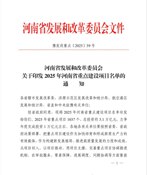 1月20日,河南省發(fā)改委發(fā)布《2025年河南省重點(diǎn)建設(shè)項(xiàng)目名單》。城發(fā)·高新生物經(jīng)濟(jì)產(chǎn)業(yè)園名列其中,入選2025年河南省重點(diǎn)建設(shè)項(xiàng)目。2025年省重點(diǎn)項(xiàng)目1037個(gè)、總投資約3.1萬億元,力爭年度完成投資1萬億元左右。