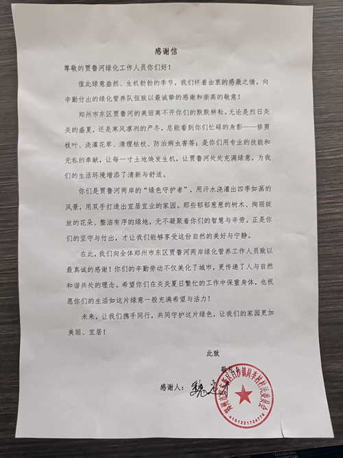 近日,鄭州市賈魯河綠化養(yǎng)護(hù)工作收獲暖心認(rèn)可。鄭東新區(qū)崗李村村委向養(yǎng)護(hù)團(tuán)隊贈送錦旗和感謝信,以“朝迎晨露修枝葉,暮披霞光護(hù)綠茵” 贊揚(yáng)工作人員的辛勤付出。