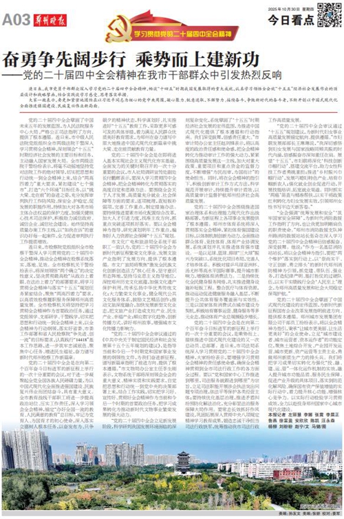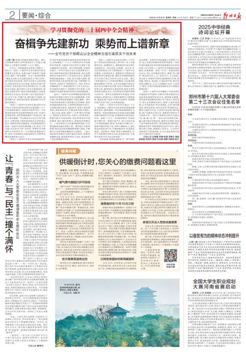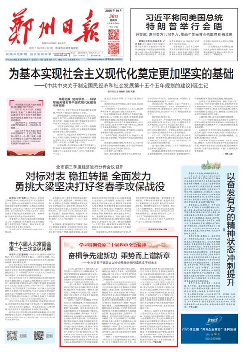 黨的二十屆四中全會擘畫了中國式現(xiàn)代化建設(shè)的宏偉藍(lán)圖,為新時代新征程國有企業(yè)改革發(fā)展指明前進(jìn)方向、提供根本遵循,鄭州城發(fā)集團(tuán)廣大黨員干部群眾深受鼓舞、倍感振奮。近日,《鄭州日報》《鄭州晚報》開設(shè)了【學(xué)習(xí)貫徹黨的二十屆四中全會精神】專欄,2025年10月30日,報道了鄭州城發(fā)集團(tuán)深入學(xué)習(xí)貫徹落實(shí)黨的二十屆四中全會精神,以全會精神為指引真抓實(shí)干創(chuàng)未來。