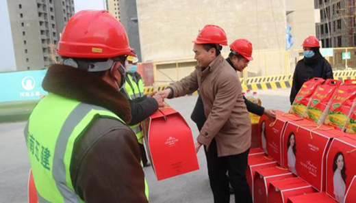 春節(jié)將至,為將工會組織的溫暖及時送到廣大工友手中, 2月7日下午,鄭州市總工會機(jī)關(guān)工會主任王銀倉、副主任張翔宇,鄭州地產(chǎn)集團(tuán)監(jiān)事會主席、工會主席李靜波、女工主任鄭琪在西流湖公司副總經(jīng)理、工會主席昌磊的陪同下,深入中原新區(qū)三十里鋪中安置區(qū)施工現(xiàn)場,開展春節(jié)送溫暖慰問活動。