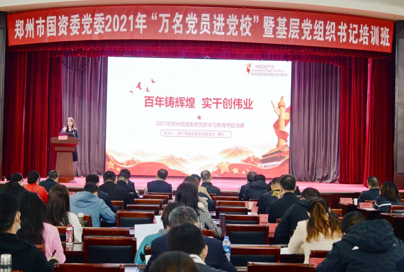 10月19日,鄭州市國(guó)資委黨委舉行2021年“萬(wàn)名黨員進(jìn)黨校”暨基層黨組織書記培訓(xùn)活動(dòng),鄭州地產(chǎn)集團(tuán)西流湖公司黨支部曹珂同志作為市國(guó)資委宣講團(tuán)成員,向市國(guó)資委黨委市管企業(yè)優(yōu)秀黨支部書記、優(yōu)秀共產(chǎn)黨員130余人進(jìn)行了以《百年鑄輝煌  實(shí)干創(chuàng)偉業(yè)》為主題的黨課宣講。